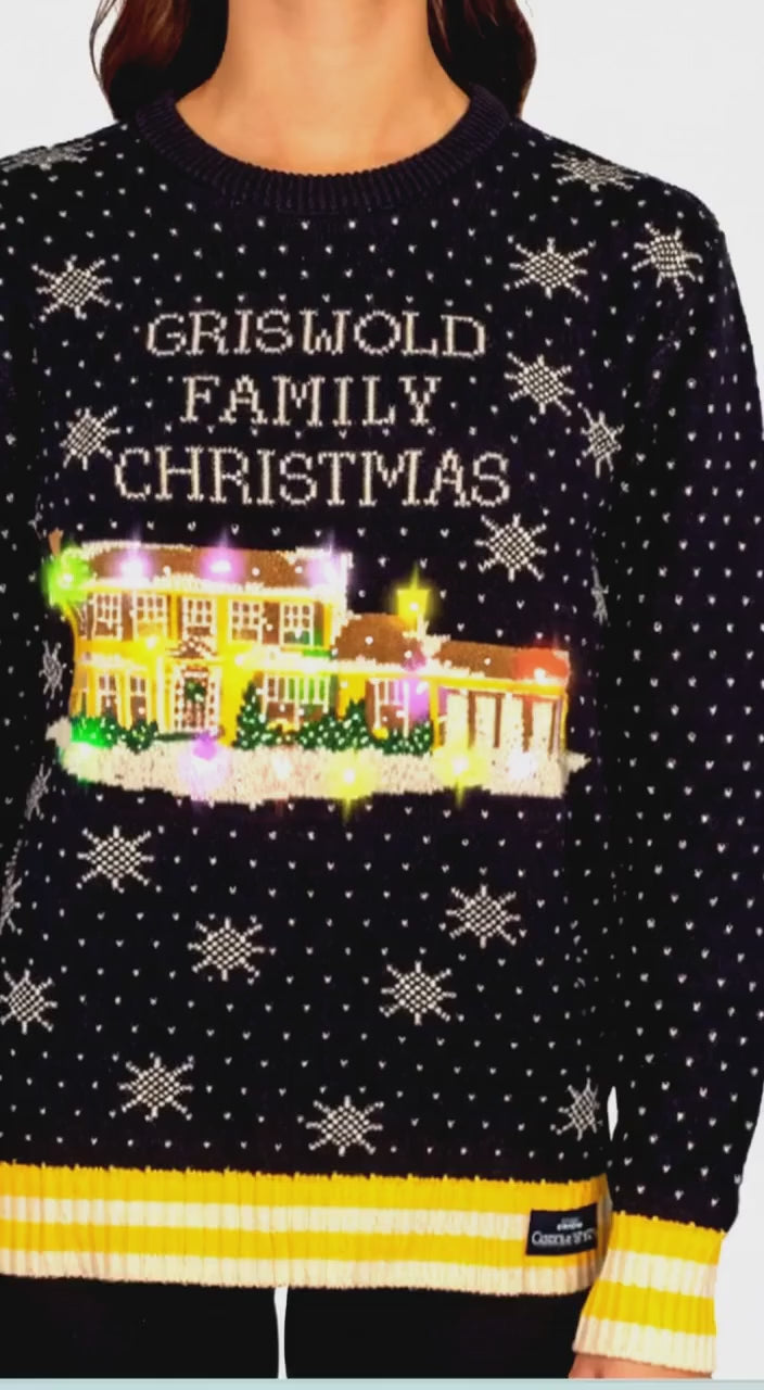 This Women’s Griswold Family Christmas Ugly Sweater features sparkling LED lights and the iconic festive house design that guarantees laughs, compliments, and major holiday vibes. Cozy, funny, and impossible to miss.